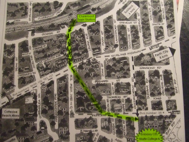 Enfim.. peguei o trem (demora uns 20 min)! Chegando na estação de Claremont… praticamente me perdi! É que a Anna e o Stirling me mostraram no dia anterior onde era estação de trem, e como chegava até a escola.. mas a gente estava de carro! É totalmente diferente! ahaha Tentei decorar algumas lojas e caminhos.. mas quando cheguei lá… não reconhecia nada! Achava até que tinha descido na estação errada! ahaha!