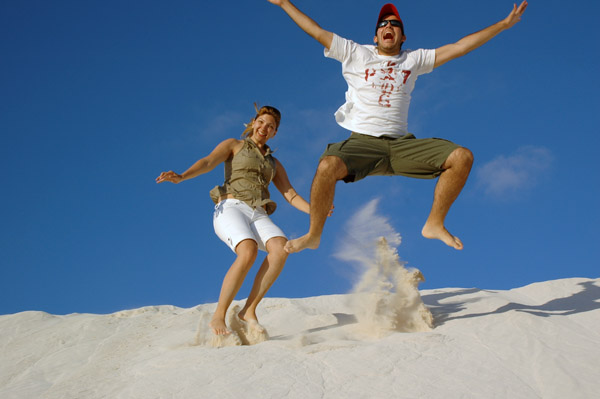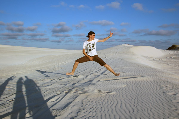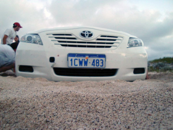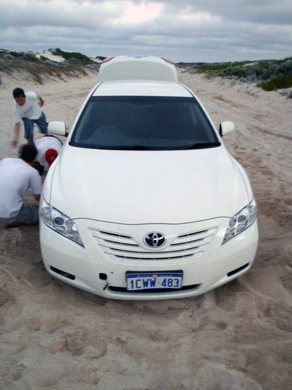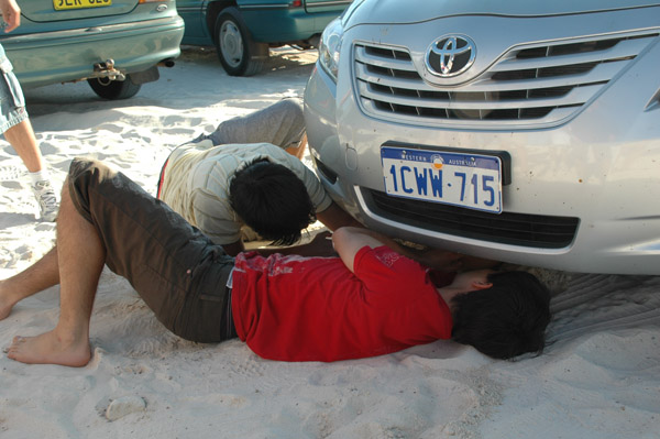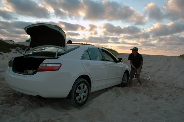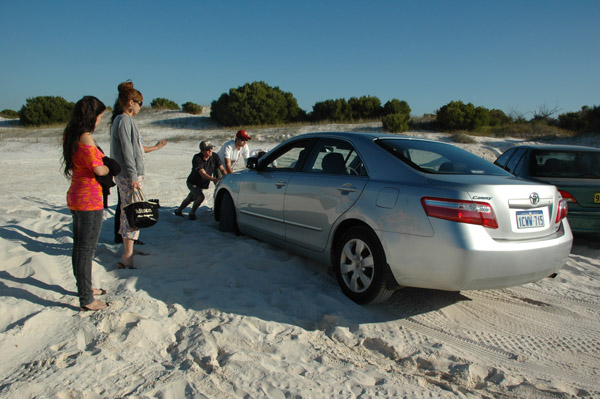 LANCELIN é onde ficam as dunas! Chegamos já no final tarde! Umas 4:30pm! Alugamos 4 pranchas de SandBoard: $20 por 2 horas, cada prancha! Duas horas SERIAM suficientes, já que a gente não queria pegar estrada a noite por causa dos cangurus! Mas… aconteceram muitos imprevistos! Logo que chegamos, o carro do Atsuo atolou no estacionamento!