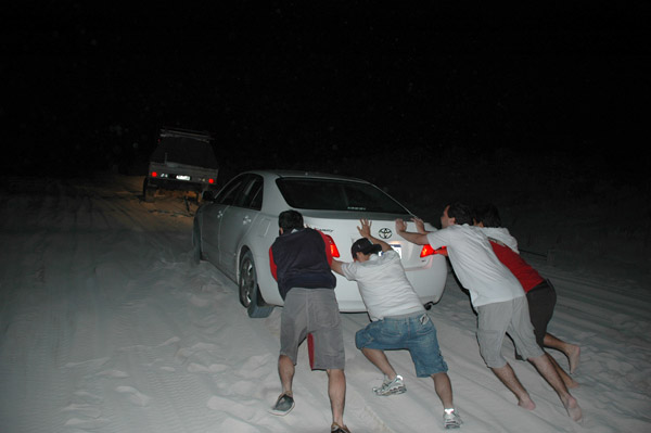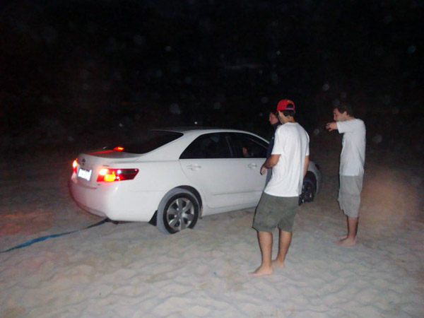 Depois que “consertaram” o carro, a gente foi mais adiante (de carro!), pois ainda estava longe de onde podia descer de prancha! Nesse caminho, o carro do Roberto ficou atolado! Aí virou uma bagunça… Tinha uma fila de carros esperando atrás da gente. Quando o Roberto conseguiu sair da areia, ele e o carro do Atsuo voltaram! Mas meu carro e do Bruno… não vimos… e continuamos! Mas a gente foi no pau pra evitar outros atolamentos! Paramos pra usar a bendita prancha! Afinal de contas o tempo estava correndo!