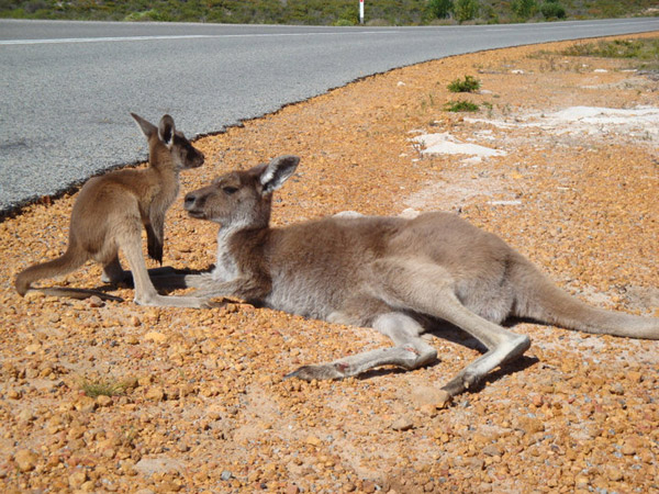 Na estrada encontramos alguns cangurus mortos. É estranho... porque no Brasil a gente encontra cachorro...! Quando estávamos indo pra Lancelin, encontramos esse filhote do lado da mãe, que estava machucada... que dó...!
