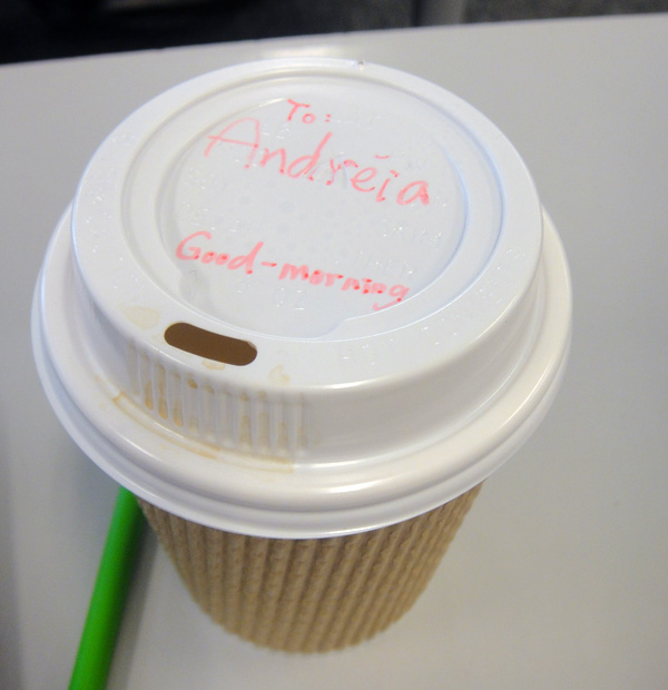 Olha que fofo no dia seguinte: a Vita levou leite com café pra mim na escola, como forma de agradecimento!!