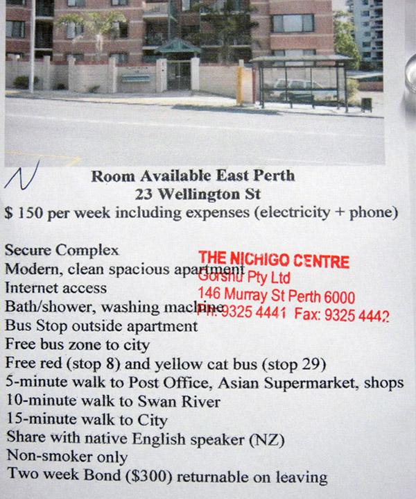 1) Procurei no famoso site • www.gumtree.com • que tem na Irlanda, Australia, Reino Unido, Singapura, Hong Kong, Nova Zelandia… e numa agência japonesa que o Cesar me falou: Nichigo Centre! Lá tem um mural cheio de anúncios!