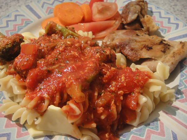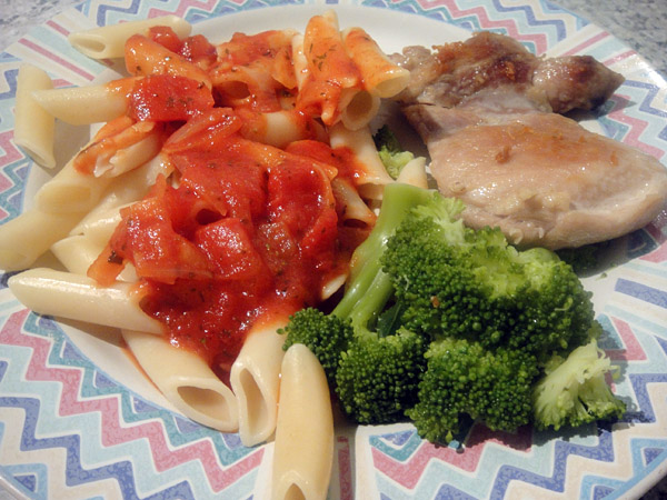 Mais macarrão! Brócolis e frango!