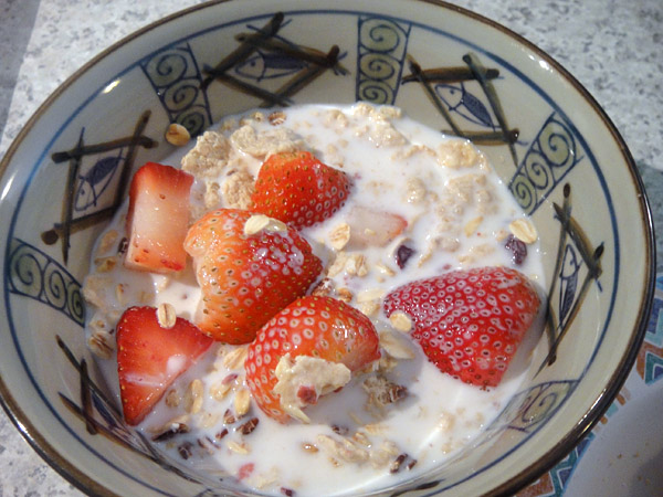 Café da manhã! Aqui todo mundo toma leite com cereais! Olha, nesse dia eu tinha comprado morangos! =D