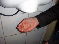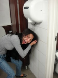 Eu e a Marie se divertindo no banheiro! Olha como o negócio de secar a mão era forte! Reparem que mão da Marie ficou até deformada com o “ventinho”! E depois ela pisou em uns papéis higiênicos, que colaram na sandália dela! AHaUAHaU!