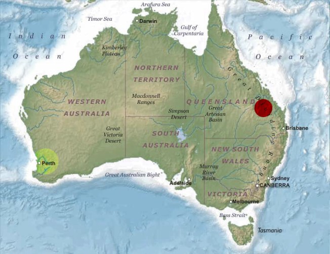 Inundação em algumas cidades no estado de Queensland (fiz um círculo vermelho). Eu estou em Perth, na costa Oeste. Bem longe...!