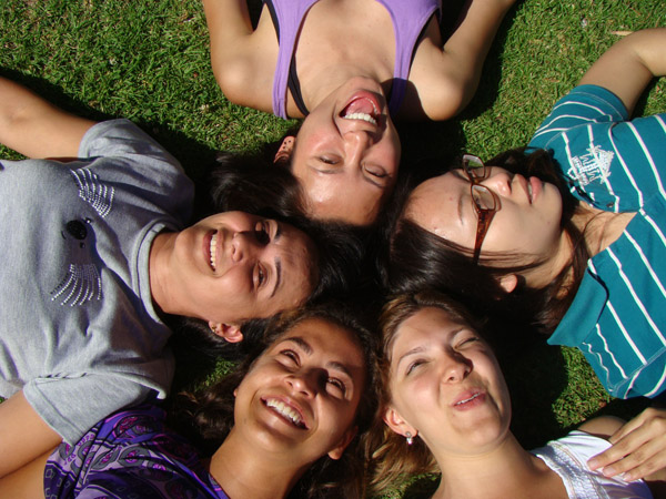 Na grama. Tava com tanto sol que a gente nem conseguia abrir o olho!