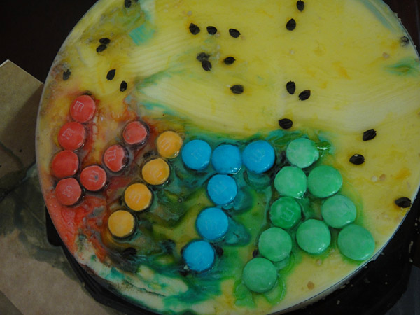Raspei o bolo, tirei todos os MMs... ficou tão feio! Mas enfim! A Vita não foi pra escola! Então tivemos que ir até ela depois da aula!! AHaUHAuA!