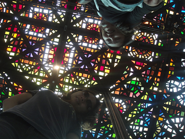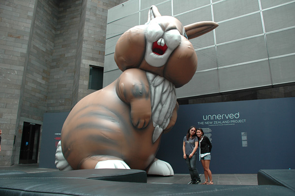 Foto com o coelho gigante! Que mico! Todo lugar que a gente ía, me sentia uma ameaça.. os seguranças sempre ficavam meio atentos com a nossa presença! rs (Reparem que tinha um quadrado no chão, em volta do coelho.. porque não podia chegar perto dele! rs)