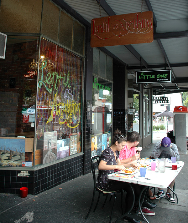 Lá pelas 2pm, a gente tava morta de fome!! O plano era pegar um ônibus pra St Kilda Beach, e achar um lugar que o Dú recomendou! Saímos perguntando onde ficava, senão nunca teríamos encontrado! HAUaHAU! Lentil as Anything, eu recomendo!!! • Esse é um restaurante vegetariano, que serve a la carte. DETALHE: você paga quanto quiser!!