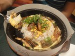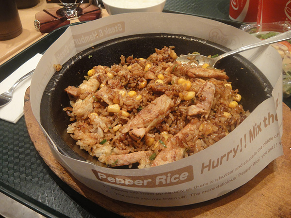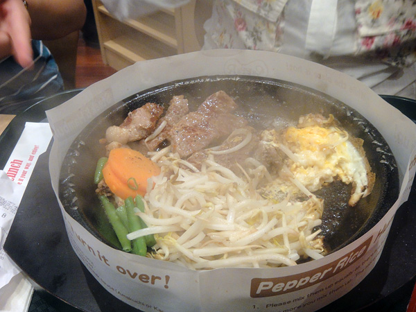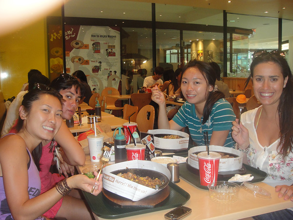Olha nossos pratos! O meu (esse primeiro) custou AU$ 8. Claro que a Dalila comeu fast-food! Ela só come isso! rs