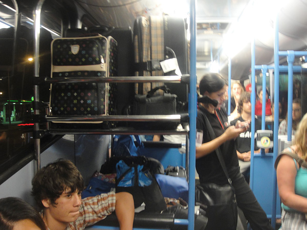Chegamos em Gold Coast! O aeroporto era muito longe de onde era nosso hostel! Gold Coast é beeem... espalhado...! Me lembrou Floripa! Você pode demorar até 1 hora pra cruzar aquela cidade! rs • Imagina o transtorno esse monte de gente tendo que colocar as malas super pesadas nesses compatrimentos aí! Ainda bem que o motorista era gente boa e ajudou a gente...! Nem a pau eu ía conseguir colocar minha mala ali! AHauaHAua! • Outra coisa: não tivemos que pagar o busão! Era pelo sistema de doação, em prol as vítimas das inundações da região. (Acho que todos acompanharam a situação na Australia em janeiro de 2011).