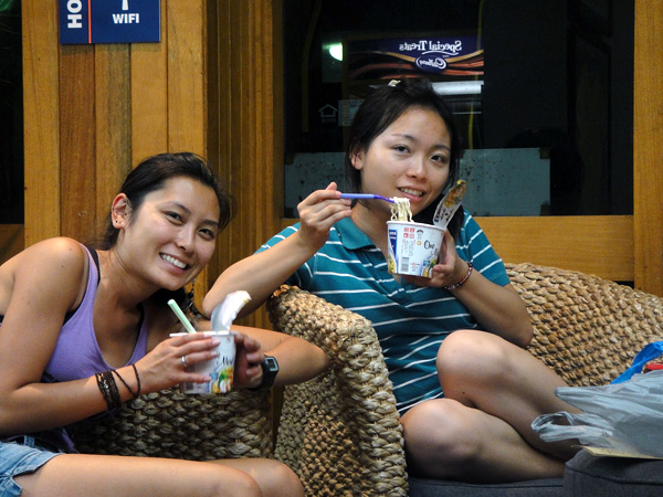 Na hora de descer do busão, a galera ajudou a gente... graças a Deus! Depois quase morri andando até o hostel! ahaha! O que mais pesava nessa história toda, era meu notebook na mochila. Fala sério! rs! Pra quem já pegou meu notebook, sabe como ele é pesado! ehehe! • Enfim.. chegamos podres e famintas! As meninas do nosso quarto já estavam dormindo, então não pudemos fazer muito barulho... E a cozinha do hostel já tinha fechado!! AHHHHHH!! O que nos salvou foi o miojo da Vita! E a moça da recepção quebrou um galho, e ferveu água pra gente! Nossa.. como tava gostoso! HAaUAHAU!