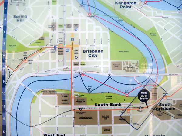Quando o trem começou entrar em Brisbane, eu e a Vita percebemos que não sabíamos nada sobre a cidade.. em qual estação parar.. fala sério! ahahah! Como vimos o rio, paramos em South Bank!