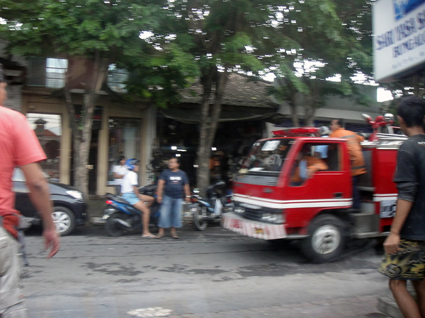 O cara embicou a van numa viela, pra poder abrir espaço pros bombeiros: primeiro, o bombeiro vem correndo...???? Acho que em Bali, é mais rápido sair correndo, do que tentar chegar de carro! rs