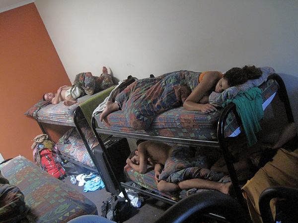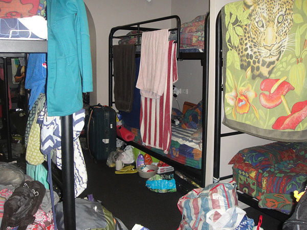 O meu quarto era pra 20 pessoas. Primeiro, foi difícil achar qual era a cama vaga... Depois, onde colocar minha mala? Era o fim! ahaha! Queria ir logo pra casa!