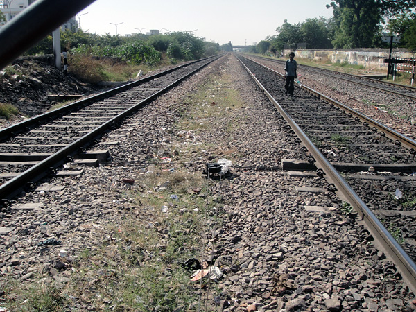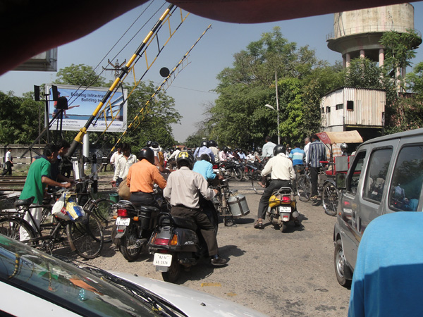 Depois tem essa rua beeem longa, até chegar na linha do trem! Já dá pra ver ali na frente, um amontoado de rickshaws!