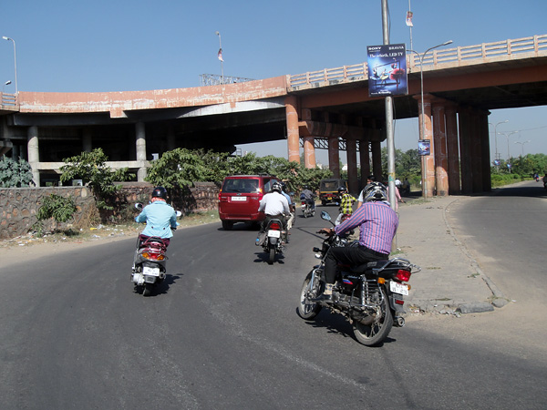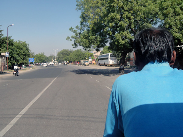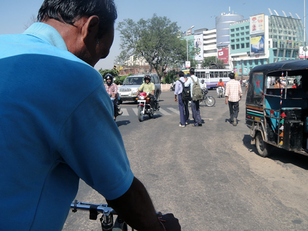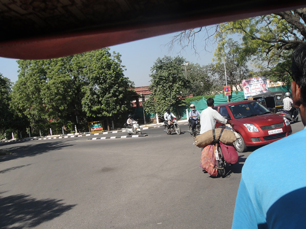 Esse é o Ram! Depois de umas 3 semanas pegando rickshaw, eu já "conhecia" alguns motoristas. E isso era bom, porque eles já sabiam o lugar que eu ía! Meu escritório fica a 7 minutos de auto-rickshaw da minha casa. Mas quando eles se perdiam, levava quase 20 minutos. Eu falava que o caminho estava errado, mas eles nunca me escutam, e continuam indo.. indo... E ter que negociar preço TODO-SANTO-DIA é também bem estressante. Só pelo fato de você ser estrangeiro, tudo fica absurdamente mais caro! Mas enfim, depois de 3 semanas, comecei ir com o mesmo tiozinho. Mas não é dos auto-rickshaws. É aqueles de bike mesmo! Geralmente eu pagava 40 rúpias (R$ 1,50) pra ir (pra voltar, mais 40 rúpias. Mas era mais difícil, porque eu tinha que pegar sempre diferente, da rua...) Mas depois eu conversei com ele, e comecei a pagar 30 rúpias. Na verdade, todos os meus colegas de trabalho me falavam que ainda sim, 30 era muito. Mas é impossível preço melhor que esse, se você é um estrangeiro. Eles não aceitam de jeito nenhum. • Minha jornada começa aí, em frente ao MGF Mall! O tiozinho pega a contramão, e entra na rotatória. No começo achava tenso, e nem gostava de olhar!