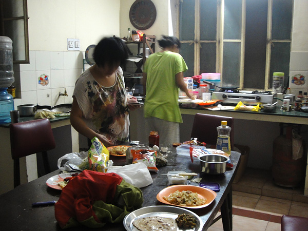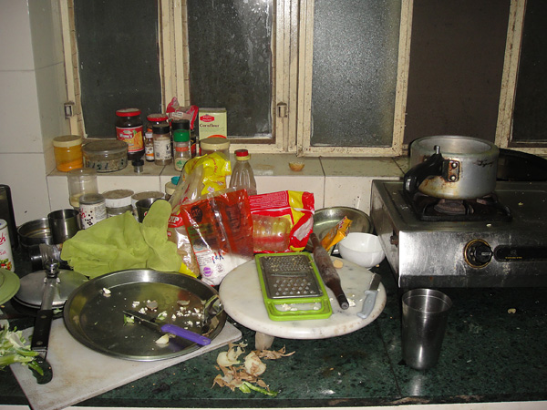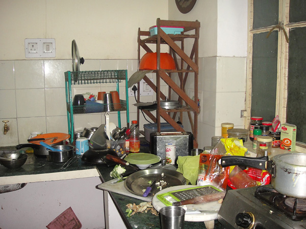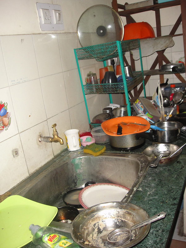 E mais bagunça! tem dia que essa pia tá uma piscina nojenta! O certo é cada um lavar o que usou. Mas nunca funcionou. Então entramos num acordo, e a gente optou por pagar uma mulher pra lavar. (100 rúpias por pessoa/por mês. Cerca de R$3,70).