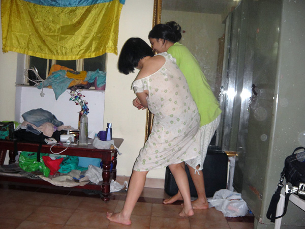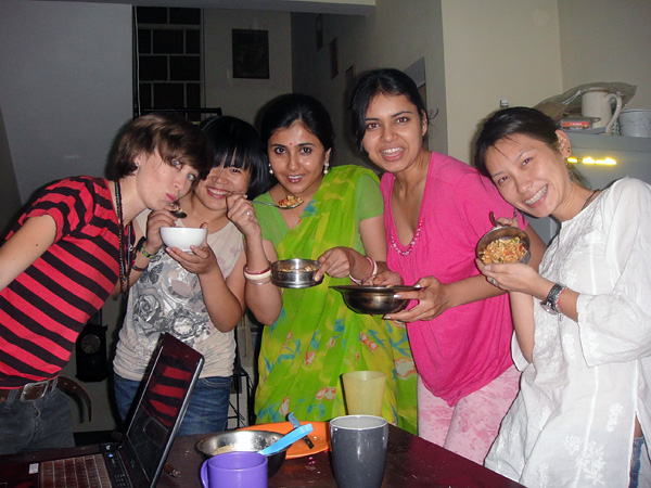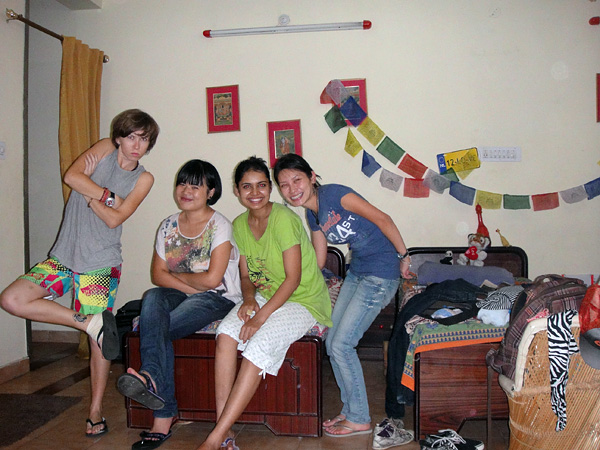 Quando eu cheguei, tinha a Shagun (não tenho nenhuma foto dela. Ela deixou o quarto 10 dias depois que eu cheguei. Digamos que... ela só era legal quando queria...) e a Dimple. Na manhã seguinte que eu cheguei, veio a Love, e depois que a Shagun foi embora, chegou a Zhoujia! • Nessa foto: Love (Ucrânia), Zhou Jia (China), Dimple (India) e eu, no nosso quarto super organizado!