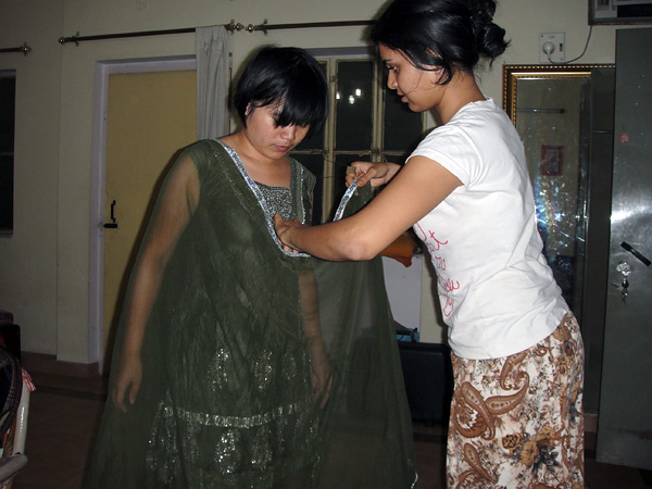 Zhou Jia provando um vestido indiano da Dimple!
