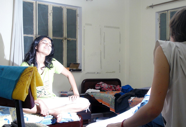 A Dimple é caçulinha da turma (porque o resto tem tudo 26 anos!). Tem 20 anos, e veio de Ajmer, uma cidade que fica a 3 horas de Jaipur. Digamos que ela é meio sortuda+rebelde, pois em geral, os pais não permitem que suAs filhAs morem sozinhas (até viajar sozinha, a maioria não permite). Ela está morando em Jaipur porque faz um curso preparatório pra ser aeromoça. O curso é caro, mas as meninas investem pelo fato da carreira oferecer um bom salário. Muitas meninas querem essa vida! Acho que no Brasil tivemos essa febre uns 10 anos atrás, se não me engano. Estava em “alta” ser aeromoça! Como ela não aprendeu inglês desde pequena (acho que por ela ter morado em cidade menor), ela estuda inglês todo dia por conta própria!