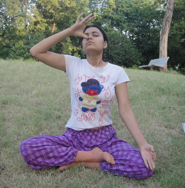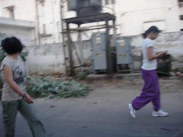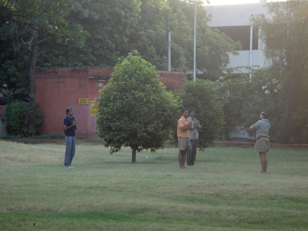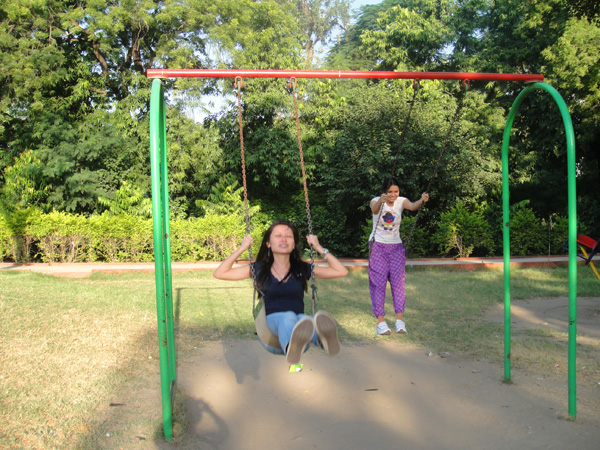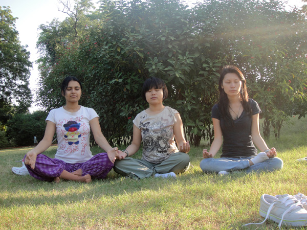 Na India, muitas pessoas praticam o yoga. Muitas, mesmo! É realmente um estilo de vida. Eles acordam cedo e vão fazer yoga! Como eu e a Zhou Jia queríamos aprender, a dona do pensionato sempre dizia pra gente acordar cedo, e caminhar até o parque… mas quem disse que a gente acordava! Sempre adiávamos! Mas daí surgiu a oportunidade da gente ir num domingo (já que era nosso único dia de folga)! Combinamos de sair bem cedinho. Mas daí foi a vez dela não aparecer pra ir! Ela não acordou! Mas tudo bem! Nossa roommate Dimple foi nossa professora!