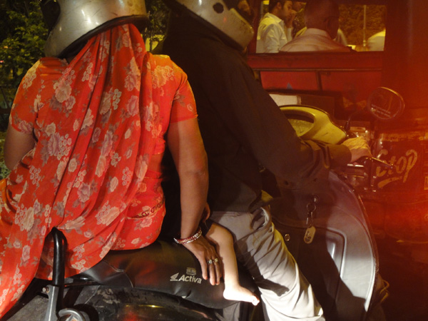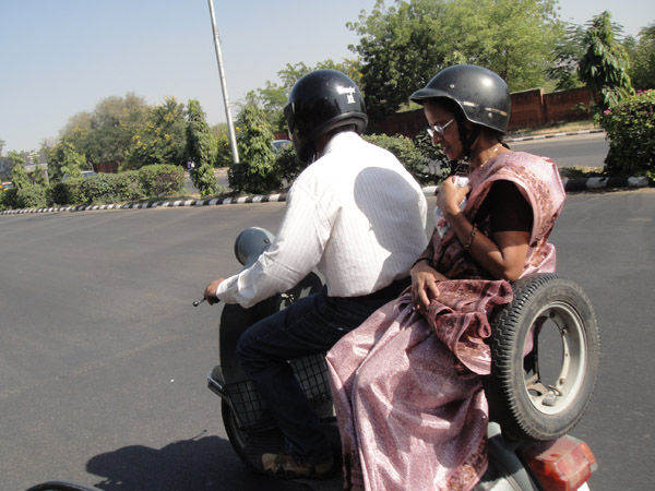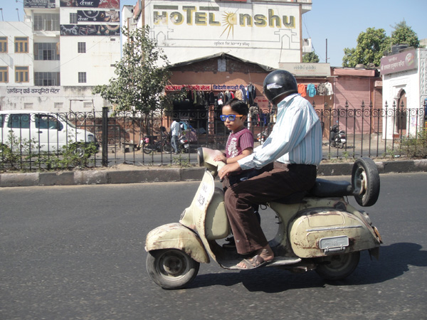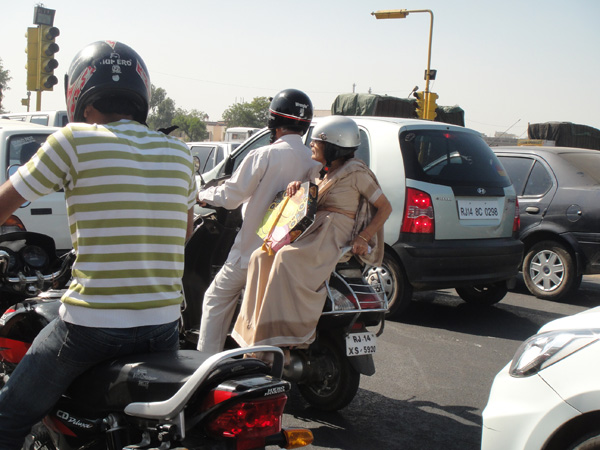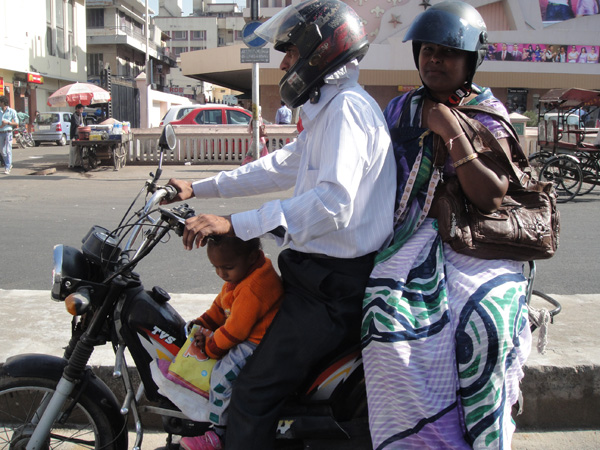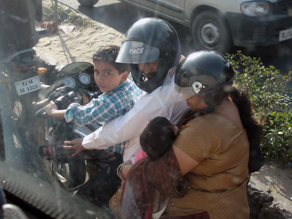 Muitas crianças pequenas nas motos. O engraçado, é que o trânsito indiano é caótico. Parece que nada é respeitado, MAS, se você não estiver usando capacete, leva multa mesmo. Tem um guarda em cada esquina. Não pra organizar o trânsito. Mas pra multar quem não está de capacete. E as crianças, como ficam?