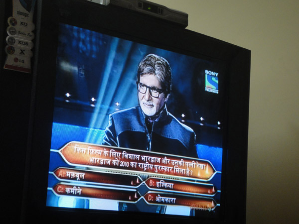 Na casa da Smriti eu assisti muiiita TV, porque na minha casa não tinha! E morar em outro país, com uma cultura tão diferente, você tem que assistir TV pra ter uma noção de como é! Assisti muita novela e.... Quem quer ser um milionário!! ahaha! E olha só: descobri que o apresentador (esse da foto) é o Amitabh Bachchan! Pra quem assistiu o filme, tem uma pergunta sobre um famoso ator indiano que ficou famoso nos anos 70.. daí ele lembra da vez que ele mergulha no coco pra conseguir um autógrafo do ator? É o próprio!