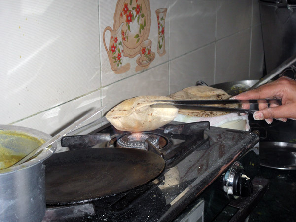 Paratha! Paratha é um tipo de chapatti com recheio! Esse tinha recheio de batata! Muiito bom! É muito interessante como é "cozido"! Primeiro ele vai direto no fogo assim, incha igual um baiacú, e depois vai na frigideira e volta a ser fininho igual panqueca!