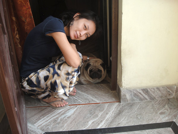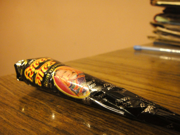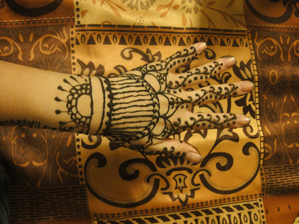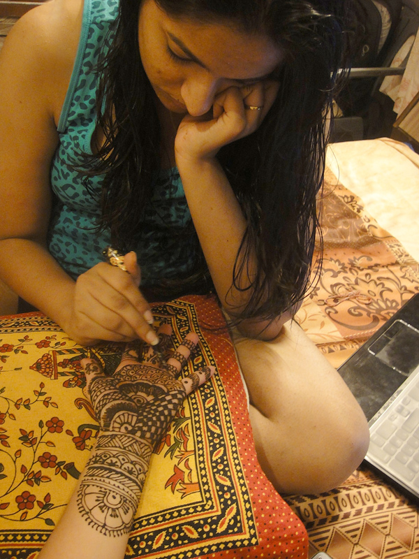 Depois de ter dado uma voltinha nas barraquinhas perto da casa da Smriti, o irmão dela comprou mehndi (henna) pra gente!