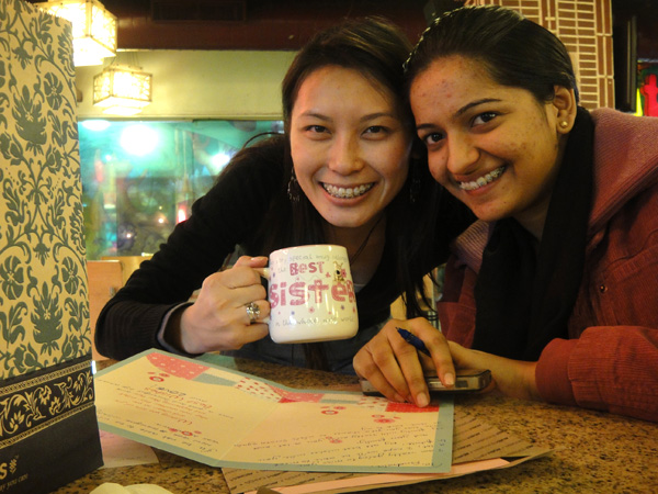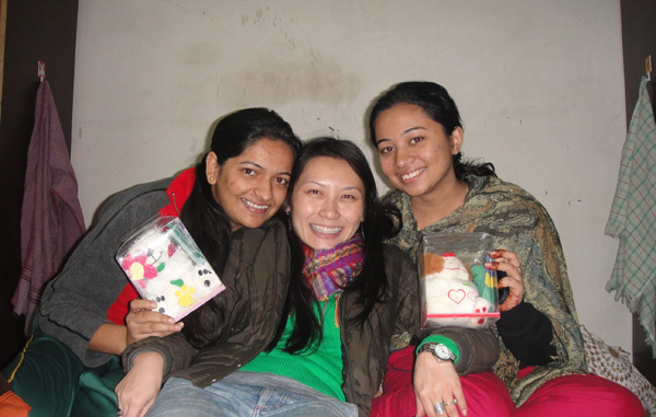 Smriti, eu e Samiksha! Dei um ursinho pra cada, com uma mensagem escrita na bandeirinha do Brasil!