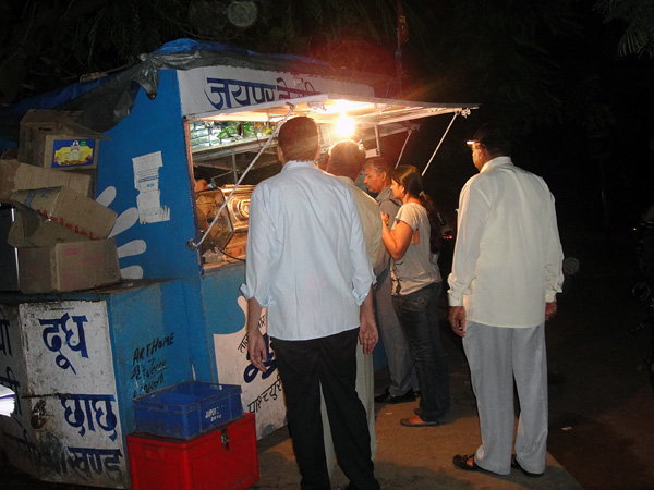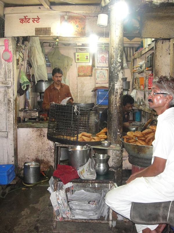 Isso é Bhel (até hoje não consigo pronunciar certo...!)! O cara enrola num pedaço de jornal (tudo aqui é enrolado no jornal!) uns... cereais..?! Com um tipo de molho vinagrete.. é meio apimentado, mas é bom!